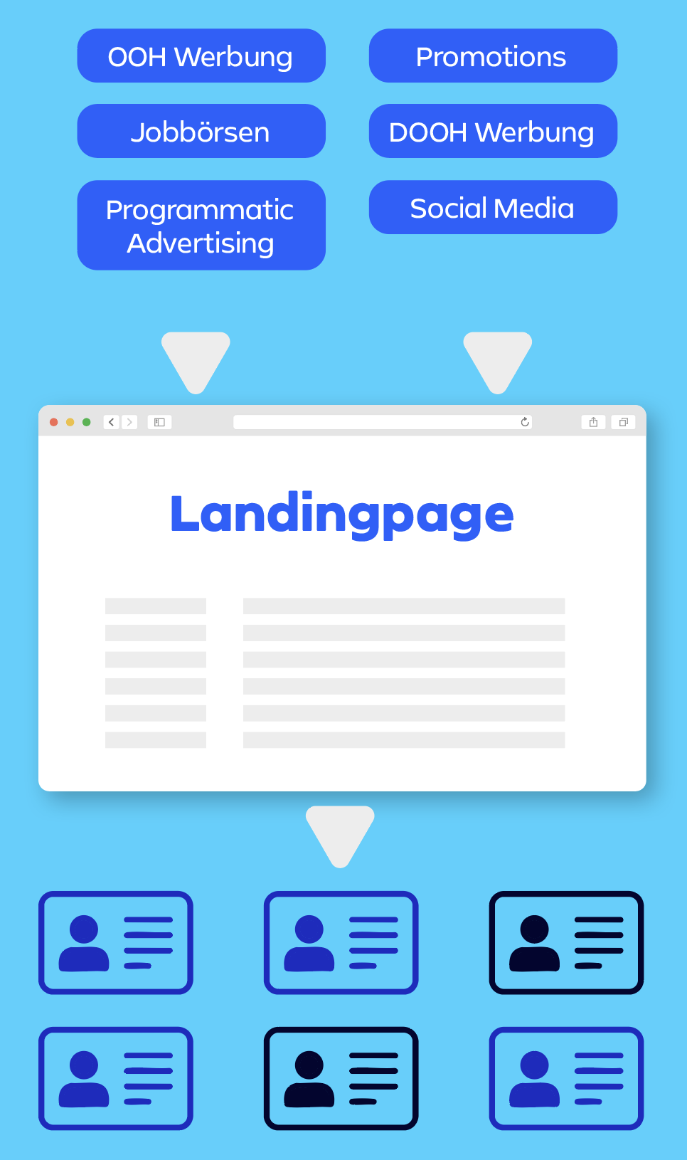 Touchpoint Recruiting combines data-driven talent outreach with strategic recruitment marketing, creating one of the most effective solutions for attracting qualified applicants. The method starts where talent is on the move: online, on mobile devices, in public spaces. Through precise targeting by demographics, location, or context, companies reach their target groups at relevant touchpoints—whether on a smartphone, on campus, or in the cityscape. For maximum impact, we design custom landing pages that are precisely tailored to the job postings and employer brand.