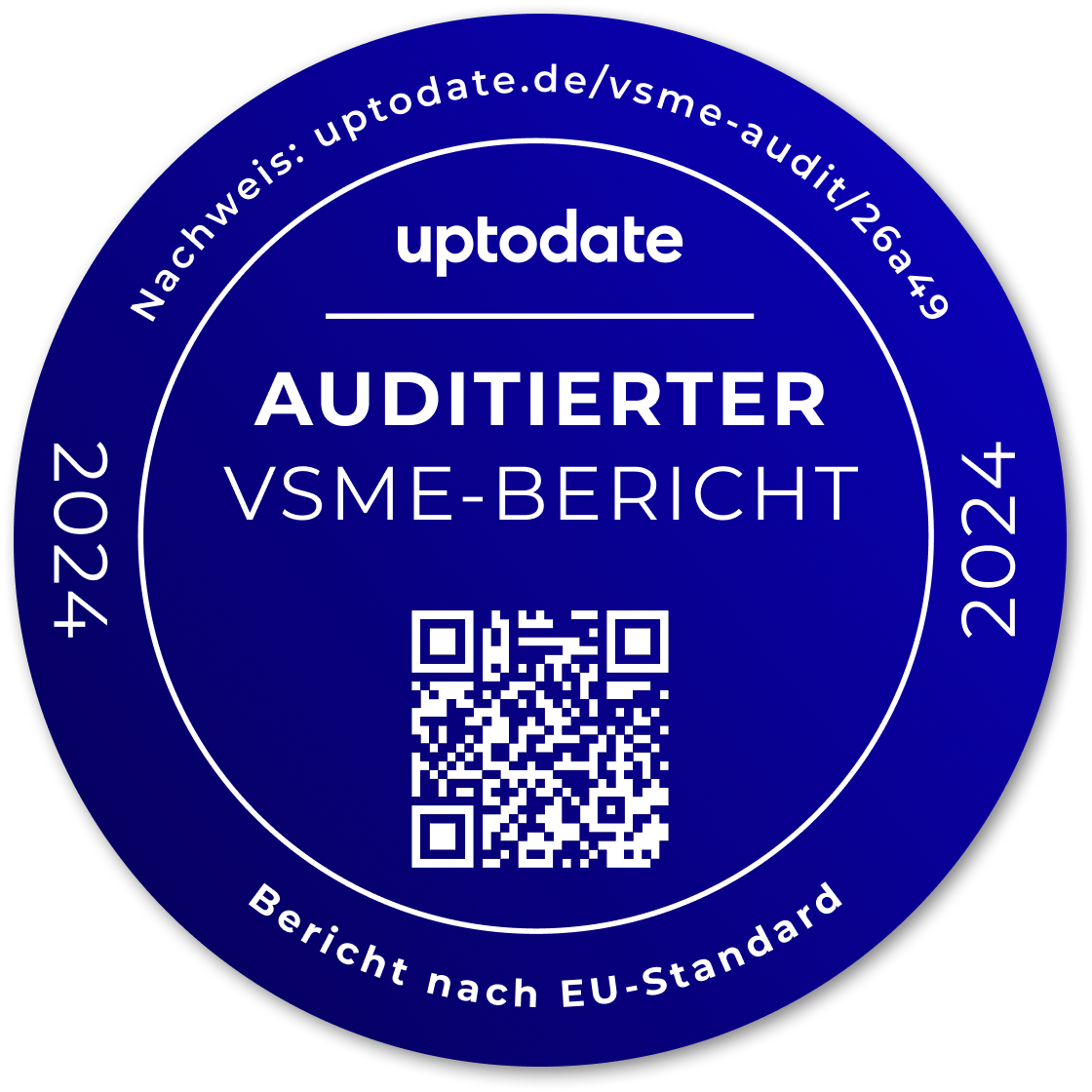 Im Rahmen der Auditierung unseres VSME‑Berichts wurden unsere Nachhaltigkeitsdaten des Geschäftsjahres 2024 durch die uptodate sustainable solutions GmbH geprüft. Struktur, Form und Inhalte unseres Nachhaltigkeitsberichts entsprechen vollständig dem VSME‑Standard der EU‑Kommission. Die Daten wurden sorgfältig erhoben, intern plausibilisiert und extern überprüft.